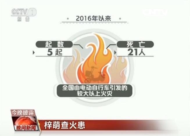 央视记者从公安部消防局了解到,2016年以来,全国由于电动自行车引发的较大以上火灾5起,造成21人死亡。