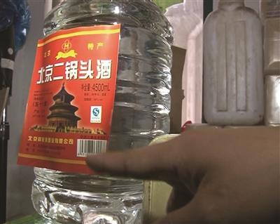 在随后的检查中,执法人员发现该店有大量的塑料包装袋,上面写着“酒店专供”字样。用塑料瓶装的4500毫升装的北京二锅头明显存在造假现象,甚至连所谓的商标都贴歪了。箱子上也没有真品的厂名厂址、配料表等信息。