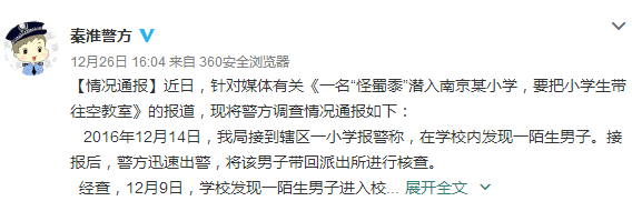 人民网北京12月27日电 针对媒体有关《一名“怪蜀黍”潜入南京某小学,要把小学生带往空教室》的报道,江苏省南京市公安局秦淮分局昨日发布调查情况通报。