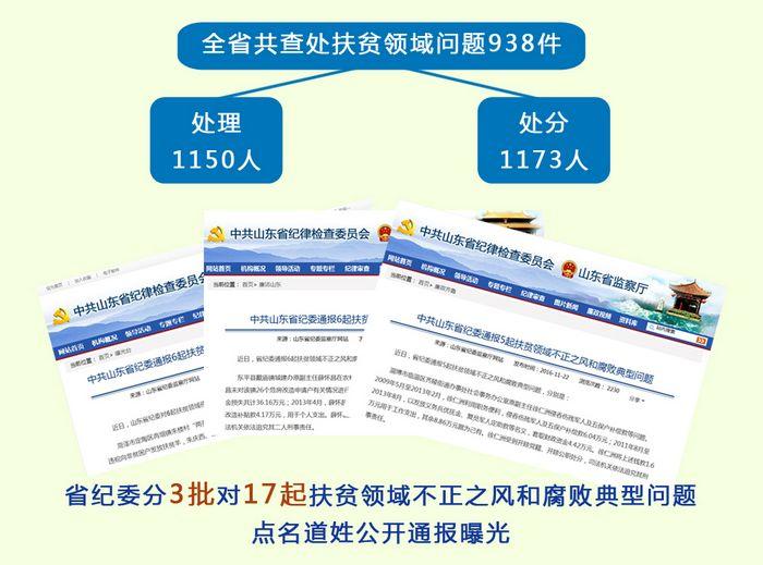 参与互动 2016年以来,山东省各级纪检监察机关严肃查处扶贫领域不正之风和腐败问题。对信访举报中涉及扶贫的问题建立移送查处工作机制,重点整治贪污挪用救济物资,截留私分扶贫款、优亲厚友,虚报冒领扶贫资金等突出问题。全省共查处扶贫领域问题938件,处理1150人,处分1173人。省纪委分3批对17起扶贫领域不正之风和腐败典型问题点名道姓公开通报曝光。