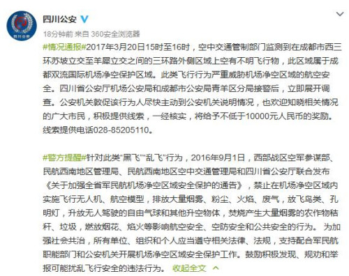 四川省公安厅官方微博通报称,2017年3月20日15时至16时,空中交通管制部门监测到在成都市西三环苏坡立交至羊犀立交之间的三环路外侧区域上空有不明飞行物,此区域属于成都双流国际机场净空保护区域。