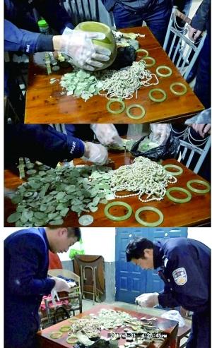 警方称,3月31日中午11时30分左右,同案犯徐二哥落网。经审讯,徐二哥对犯罪事实供认不讳,并交代了部分赃物的去向。在徐二哥的指认下,警方在其老家临海市括苍镇相关住所起获部分赃物(见图)。当天晚上11时许,警方根据落网的两个嫌犯交代的情况,锁定了一金店老板张某为当年收购赃物的犯罪嫌疑人,在临海市某一小区将其抓获。
