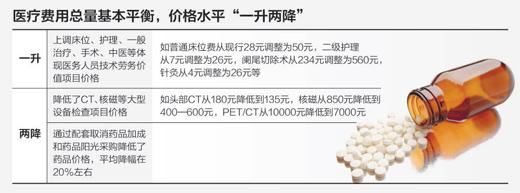 北京市卫生计生委新闻发言人高小俊介绍说,调整后患者费用总体负担水平没有增加。改革保持全市医疗费用总量基本平衡,价格水平“一升两降”:上调床位、护理、一般治疗、手术、中医等体现医务人员技术劳务价值项目价格;降低了CT、核磁等大型设备检查项目价格;降低了药品价格。高小俊举例说,如普通床位费从现行28元调整为50元,二级护理从7元调整为26元,阑尾切除术从234元调整为560元等;头部CT从180元降低到135元,核磁从850元降低到400—600元,PET/CT从10000元降低到7000元;而通过配套取消药品加成和药品阳光采购,药品价格平均降幅20%左右。