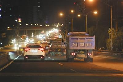 2016年10月22日晚8时,两辆河北牌拉土车在三环内劲松中街道路上行驶。资料图片/新京报记者 侯少卿 摄