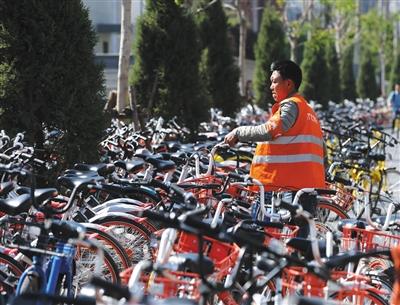 4月20日,北工大地铁站c口,一名共享单车护管员将一辆辆乱放的共享单车搬到路边排好。