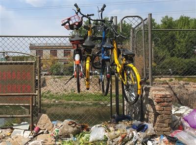 4月12日,朝阳区崔各庄南皋村北口,一处垃圾堆里挂着四辆共享单车,一旁就是设立的警示牌。