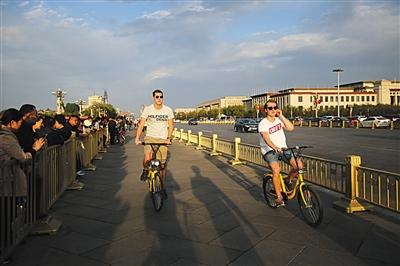 4月12日,长安街、后海和故宫附近,很多中外游客选择使用共享单车出行游玩。