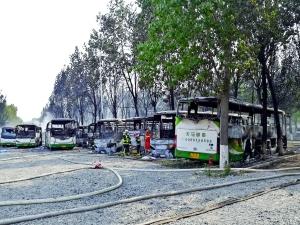北京晨报记者抵达现场后看到,停车场北侧院墙外的草地已焦黑一片,地上冒着烟。从停车场东北侧门进入,多个标牌显示“大客车出口”。场中央自北向南一排大巴车烧得只剩空壳,大巴车旁的一排树木被火烧枯(如图)。由于现场封锁,且有树木遮挡,记者无法清楚统计烧毁大巴车的数量,初步估计至少有数十辆。