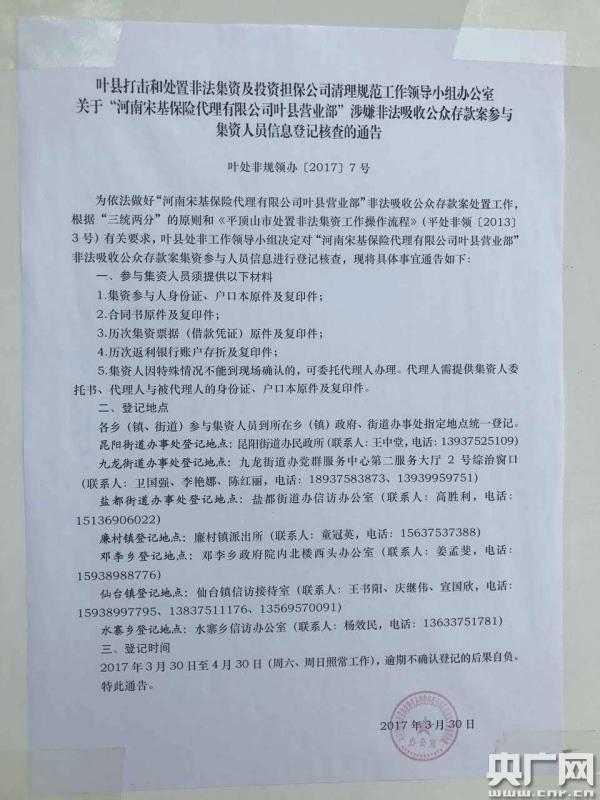 今年3月30日,叶县打击和处置非法集资以投资担保公司清理规范工作领导小组办公室发文,对“河南宋基保险代理有限公司叶县营业部”“非法吸收公众存款案”集资参与人员进行信息统计,登记工作已经于4月30日完成。