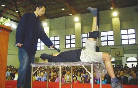 几年前,萧宏慈在向学员讲解示范“拉筋凳”的使用。他称,拍打拉筋治百病。图片来源萧宏慈的博客。