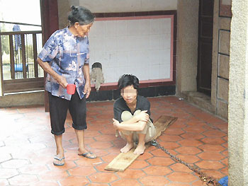 前两天,记者陪同主审法官来到柳纯绿家中时,她正躺在院子里一块木板上睡觉,苍蝇在她的头上盘旋,铁链的一头拴在她身上,另一头拴在院子里的柱子上,铁链上还加了四五把锁。柳纯绿的奶奶拎着一小袋垃圾刚到家,袋子里装满了饮料瓶和废纸。奶奶说,现在家里只剩下她和孙女两人相依为命,她们两人的生活费只能依靠她每月只有120元的低保金。可是,这些钱根本不够两个人吃饭,79岁的老奶奶只好去捡垃圾卖,一个月多挣几十元钱,补贴两人的生活费。