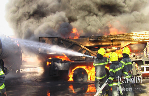 一中队于09时34分到达火灾现场后经观察及询问知情人,停车场院内1辆载重28.58吨凝淅油油罐车和3辆吊车着火,邻近的另外3辆吊车、20余辆货车及汽车修理铺受到威胁,油罐随时发生爆炸,如不及时控制火势,造成的后果将不堪设想。