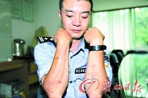 昨日,记者在流花交警大队看到受伤的何警官,他的双腿被高速行驶的面包车严重擦伤,手部、胳膊被划伤,胸口被面包车司机锤打至红肿。