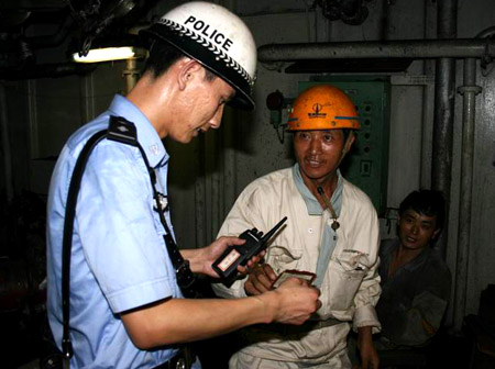 为进一步锻炼、检验应急反应和协同作战能力,消除对外开放口岸安全隐患,8月9日、10日两天,(上海)金山边检站与市局水上公安局在龙吴路沿江部分对外开放码头举行了代号为“江盾”的联合演练,通过实战提高双方应对口岸突发事件的能力,为奥运盛会的平安举行保驾护航。演练阶段,由双方分别对码头安保工作、登轮管理工作及外轮自管工作展开专项检查,并向外轮船员、码头工作人员宣传双方在奥运会举行期间将采取的服务、管理举措。值得一提的是,演练过程中,多艘驳船企图趁夜色非法搭靠外轮从事不法交易,在双方的密切配合下,成功制止了其不法行为。(新华网上海频道 记者陈飞 通讯员唐杰摄影报道)