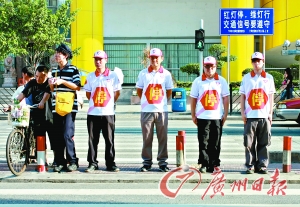 前胸“红灯”,后背“绿灯”,昨天,中山五路和吉祥路路口,十多名广州青年志愿者身着“志愿红路灯”的T恤衫,不停地用转体动作引导行人遵章过马路(如上图,颜士然摄),独特的创意引起市民好奇。志愿者们还拉起横幅,提醒大家遵守交通规则。