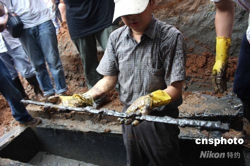 8月21日,江苏连云港市文管会考古人员在新浦区云台乡丹霞村双棺夫妻汉墓中清理出一把宝剑。当天,江苏连云港市文管会考古人员对新浦区云台乡丹霞村一处七米多深地下发现的双棺夫妻汉墓进行发掘,共清理出汉代五铢钱、银簪、宝剑、书刀、竹笥、竹简等一百余件汉代文物,具有极高的考古研究价值。中新社发 穆道勇 摄