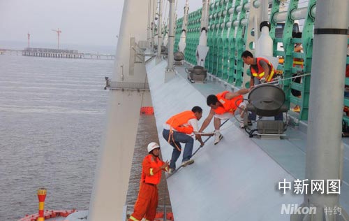 中新网宁波8月22日电(见习记者 何蒋勇 通讯员 张文荣)21日16时50分,位于杭州湾跨海大桥南航道位置,大桥养护中心的3名工作人员在大桥箱梁下面的检修车上作业时被困。半小时后,三人被安全救出。 这也是世界第一跨海大桥——杭州湾跨海大桥上发生的第一次救人行动。