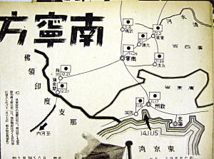 该画报的第2页上的“战局”栏目头条,就是侵略广西的报道,不过被粉饰成了“进入”。第3页刊登的两幅大照片,是日本侵略者举枪欢呼的“钦州入城”和在钦州附近竹林作战的画面。