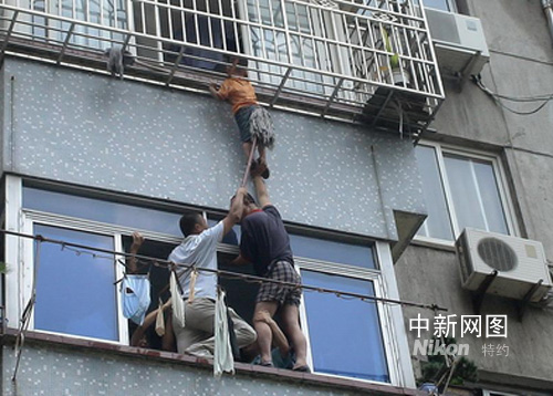 中新网嘉兴8月26日电(记者 江耘 通讯员 桐消) 26日中午,浙江桐乡市区九曲小区发生了惊险的一幕,一名5岁的男孩子爬到阳台上玩时不小心掉下来,头被卡住,人悬在半空中,家人被惊出一身冷汗。幸亏消防队员来得快,及时化解了这次惊心动魄的险情。