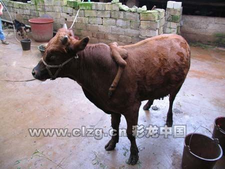 该牛是李国林1年前从邻村的农户家花800元买来的。随着牛慢慢长大,肩膀上两只脚也越来越明显,如今牛有一米高,背上的两条腿有50多厘米长,引来许多村民们好奇的目光。李国林说,前段时间,会泽有个公园出价36000元想购买此牛,他没卖。“我还要再考虑一下,也许还有人出更高的价。”(本文来源:彩龙中国)