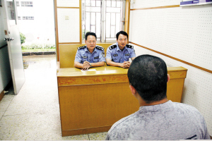 许国生(左)在对罪犯进行审问。