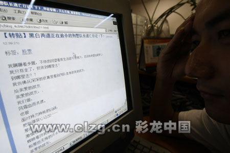 网友上网观看关于“刑警队长逃亡日记”的帖子。王磊 摄