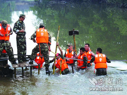 1日下午4时许,趁着复兴河洪水水位下降之时,20余名水性好的武警官兵跳入水中,先用一根粗粗的防护绳从崩岸的一边拉向另一边,形成一道“防护带”,避免自己在抢险过程中被激流冲走。