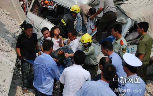 第一组率先营救左边第三排座位上伤势较重的女子。该女子正好卡在车厢及工程车车抖前部凸出的挡板所产生的空隙处,整个上半身露在车外,下半身动弹不得。队员们先利用无齿锯对变型的车厢及车窗进行切割。为防止火星溅伤女子,消防队员找来了衣物将女子身体护住,并不断对其进行安慰。因工程车车抖前部凸出的挡板正好挤住车厢,消防队员在切割的同时拿出千斤顶进行扩张,扩大营救面,两名个子较小的队员爬入车内对被压女子双腿间的石灰进行清理,并利用液压剪对变型的车椅进行破拆。30分钟后,消防队员成功地将第一名被困者救出。