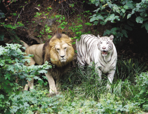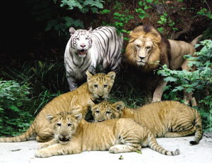 据了解,狮虎兽的父母是一只雄性非洲狮和雌性孟加拉白虎“小雪”,都是2002年在红山动物园出生的,一起生活在“狮虎生态园”,感情很好。当初跟它们一起关进园里的还有另外五只猛兽,包括两只母狮,一公一母两只虎,以及一只母白虎。可是这只雄性非洲狮就是喜欢跟“小雪”待在一起,对自己的同类——两只母非洲狮反倒不理不睬。后来,工作人员先后移出了两狮两虎,园里只留下“小雪”、雄性非洲狮,和一只母东北虎。园子里“太平”了,“小雪”跟它的狮“哥”更是形影不离,亲密不已,那只母东北虎成了“电灯泡”。