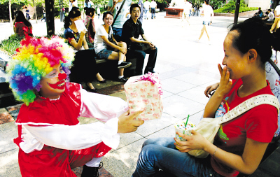 “小姐,你好,请接受我的礼物……”昨日中午,在沙区三峡广场,一名穿着红色小丑服,手拿一盒包装好的礼物,单膝下跪在一名漂亮女子面前。为了逗女孩开心,他还唱起《两只老虎》,惹得路人哈哈大笑。然而,那名女子的神情却非常惊讶……原来,小丑是一家道歉公司的员工,正按客人要求给人道歉。记者了解到,湖南男子彭敏于上月成立的“重庆快乐家族公司”,是本市首家专门帮人道歉的公司。