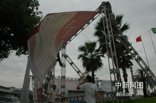 工人在浙江台州一国庆车展现场加固施工,以应对超强台风“蔷薇”的到来。作者:陈林聪