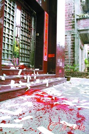昨日(10)凌晨,佛山市顺德区新隆村村主任陈某的宅所遭袭。陈宅的大门被人用铁链反锁,并浇满红油漆,肇事者临走前,还在门口点起了白蜡烛,撒下了大量冥币和纸钱。