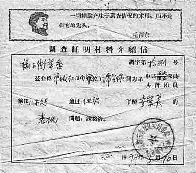“那个年代的中国人,没有介绍信寸步难行。1971年,黄梅县文化馆有机会去武汉参加文艺演出放电影,同事小袁老家在武汉,我们就让他拿着介绍信带着胶片去了。没想到小袁把介绍信揣在兜里,洗衣服时给洗坏了。正巧遇上工人纠察队,小袁拿不出介绍信,被当作‘黑户’给纠察去,单位领导赶去才把他接出来。”