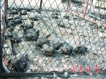 随后记者上到楼顶,眼前的一幕出乎意料:五六个一人多高的铁笼摆在一起,此外还有两三间铁架搭成的小屋。一场大火过后,除了靠西侧的两个铁笼,东边的铁笼和小屋都被烧得一片狼藉,只剩下铁架子。楼顶数十平方米的地面熏得漆黑一片,铁笼内的物品也都化为灰烬,有几处还在不停地冒着白烟。