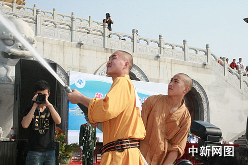 图为寺院僧人在进行手抬机动泵单干线出一支水枪操的比拼。