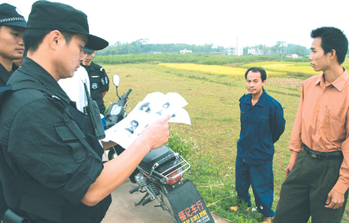 图为警方在合浦县白沙镇瓦窑岭村的进出路口设卡搜捕“9·18”专案在逃人员