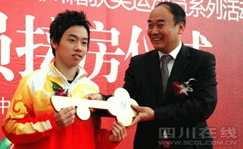 昨天上午的成都温江金强大学城广场前热闹非凡,四川省体育局在此表彰北京奥运会上夺牌的川籍运动员。邹凯、吕远洋、陈朝霞、张益萌、蒋婷婷、蒋文文和王娜等在北京奥运会上为四川争光添彩的运动员接受了由某房地产商赠送的住房。其中,独揽三金的“体操王子”邹凯开心地接过了一套近200平方米跃层住房的钥匙,而帆板金牌得主殷剑则获得一套三居室住房,此外,获得北京奥运会银牌和铜牌的四川选手也分别获得套二和套一的住房。