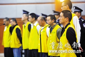 能容纳百多人的九龙坡区法院1法庭座无虚席。该院派出刑事审判庭副庭长贾飞任审判长,四名武警把守法庭大门,维持现场秩序。