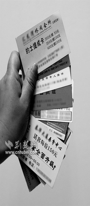 一名的哥向记者出示了五花八门的“提成卡”。武珞路一酒店的“会所”名片上,用词分外“热情”:的哥您好!全部都是贵宾房,所以提成快!每位提150元,有专人接待;紫阳东路某休闲会所干脆直接打出“的士提成卡”,并明码标价:300元提50元,400元提150元。