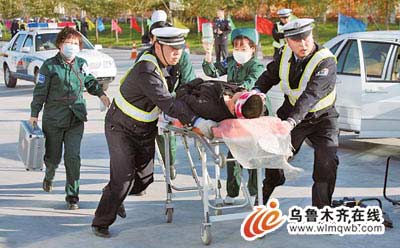 交警和120急救人员展开现场急救运送“伤者”。