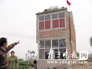 近日,记者来到了位于友谊河路上的七桥瓮湿地公园。这处公园占地约1000亩,周围湖光山色,风景很美。工人们正在栽种毛竹,为公园开园做最后的准备。没走多久,一幢顶上插着国旗的砖砌2层小楼就出现在记者眼前。走近一看,小楼的正面还用红漆刷着“用鲜血和生命捍卫国家物权法”、“用鲜血和生命捍卫238号文”等“标语”,与周围安逸休闲的自然环境相比,显得很是突兀。