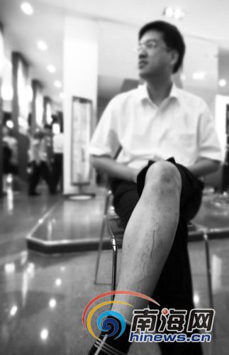 今天上午,记者陪同李先生来到海口市疾病预防控制中心检查。记者看到:李先生左小腿正面多处被抓伤、咬伤,伤口仍然清晰可见。经鉴定,李先生左腿已造成同类伤情最高级别的三级暴露伤(单位多处贯穿性皮肤咬伤抓伤;破损皮肤被舔;粘膜被动物体液污染),需要注射狂犬病疫苗5支,免疫球蛋白8支,共花费1759元。