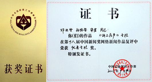 “网上民声”获第十八届中国新闻奖网络新闻作品复评“优秀栏目”奖