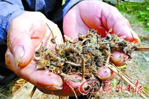 昨日,记者在始兴县沈所镇大岭下村养蜂大户卢春光家中看见,数百只蜜蜂东倒西歪地挣扎着,还有一百多只蜜蜂则像喝醉了酒似的在空中四处乱飞。