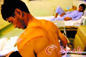肖贵保是受伤的8人当中伤势最重的一个,其主治医生介绍,他面部正中一刀,刀痕从右眼正中间一直延伸到上嘴唇,后腰也被砍了一道长12厘米左右的伤口。
