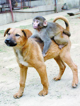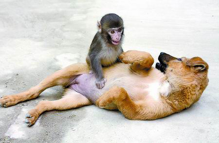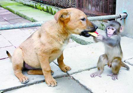 昨天(5日)上午,记者在驻马店市南海公园动物园看到,一只6个月大的雌性小狗与年龄比自己小一个月的雄性猴崽愉快地在一起玩耍。