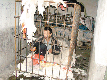 该村村民告诉记者,今年37岁的薛建仓在17岁时遭遇抢劫受到强烈刺激,患上精神分裂症,十多年前其父因病去世,母亲半身不遂卧病在床,薛建仓现由他的大姐照顾。2006年6月,薛建仓病发时将叔叔砍死,今年8月份,他又发病,一把火将自家房屋烧毁。由于发病时的薛建仓极具攻击性,曾多次袭击附近村民,并扬言要杀人,为了全村人的安全,村民与薛建仓的姐夫董选斌商量,在没有想出好办法之前,将薛建仓用铁笼囚禁了起来。这个钢筋焊成的铁笼长2米,宽1米,高约1.4米,一堆破碎的棉絮散落在笼内,薛建仓吃住就在其中。
