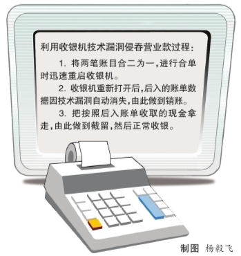 发现这个“秘密”后,杨某打起了歪主意。“当天打烊时,我合了两份单并重启了收银机,利用技术漏洞销掉其中一笔100元的账,将已收的100元现金拿走。担心了一夜,结果第二天风平浪静。”