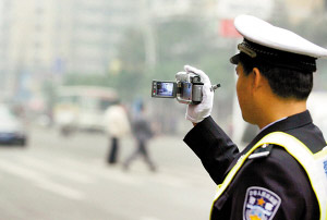 沙区交警在摄像纠违。交警以后将推行阳光执法,在摄像点前摆放醒目标识。
