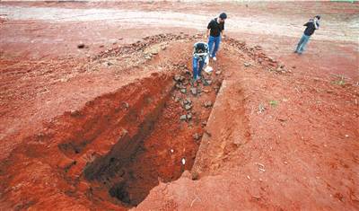 从山坡上可以看到出土汉代耳珰的平台已经被挖空了一大块。据唐涛介绍:“6月初他们刚刚开工不久,我们(郴州市文物管理处)6月4日就在这块被挖空的平台发现了一座汉代砖室墓,当时下达了‘停工通知书’,告知建设方,需经我们对墓葬发掘后才能再动工。”但是一纸文书如石沉大海,郴州市文物管理处没有接到建设方的任何回复。
